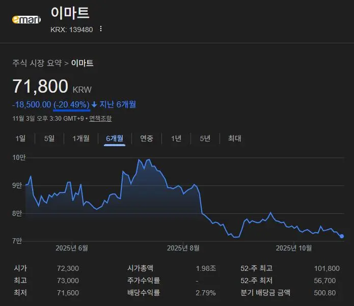 이마트 6개월간 20% 하락