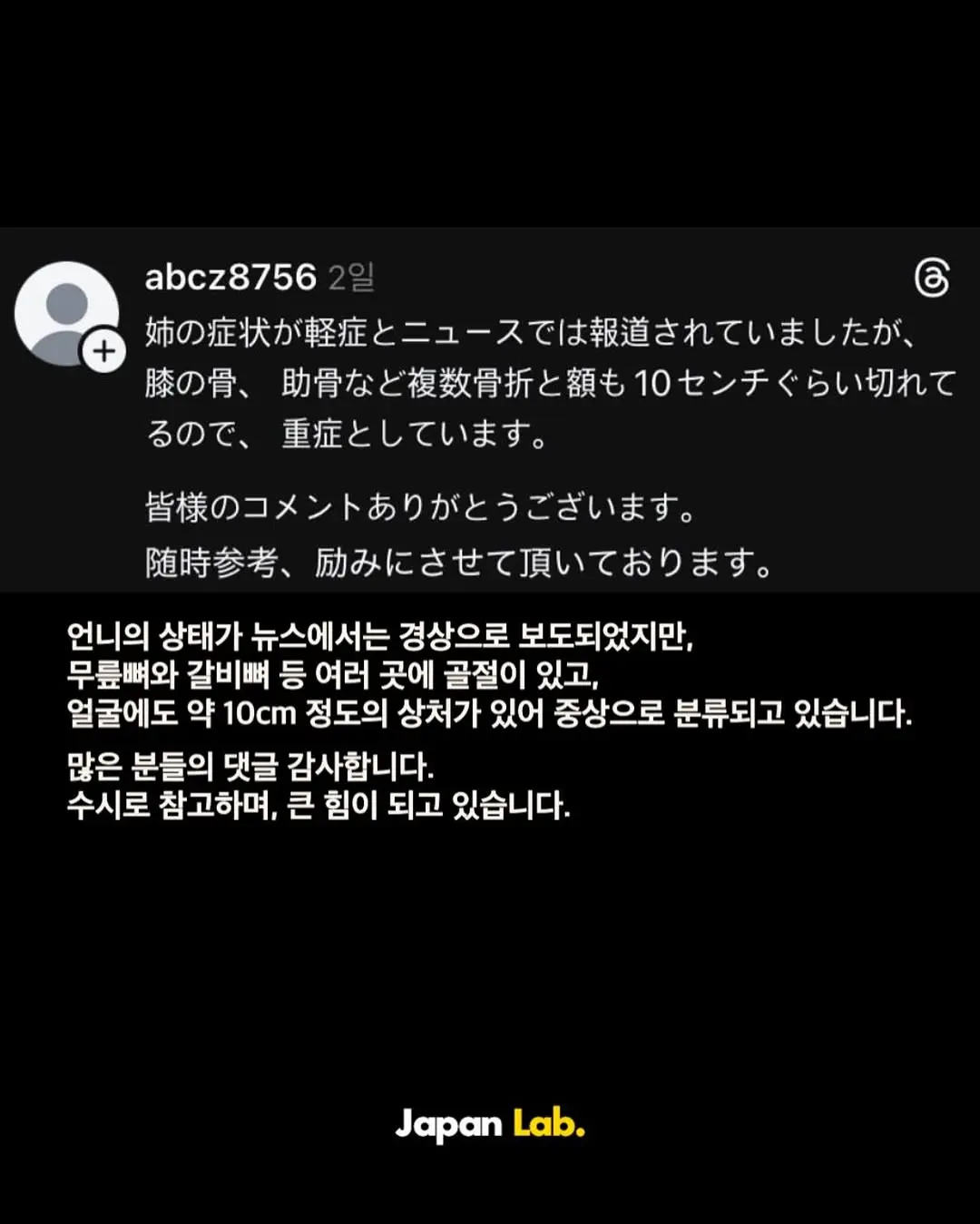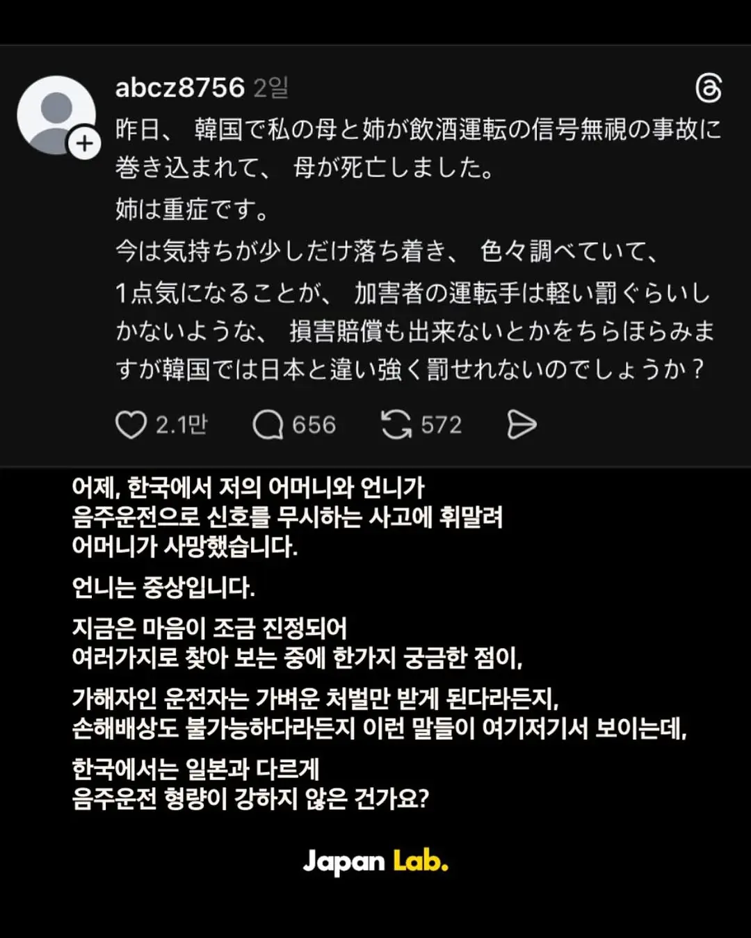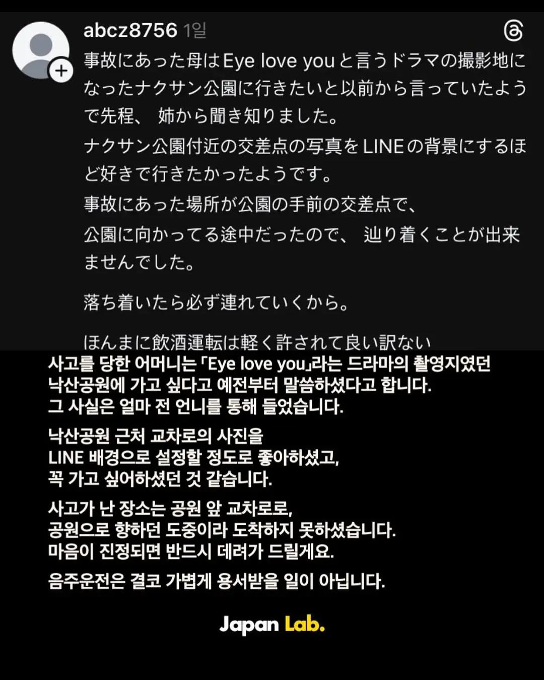음주운전 일본인 사망사고 피해자 가족의 글