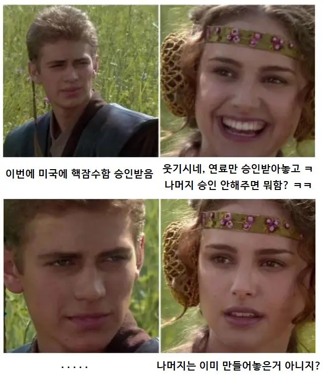 미국 : 한국아 원잠 그래서 얼마나 걸릴 것 같아? 한국 : 5... 미국 : 아 5년? 한국 : 4...3...2...1... 미국 : 한국아 잠수함 연료만 핵이지? 한국 : 네 그렇습니다. 미국 : 그래 열심히하자