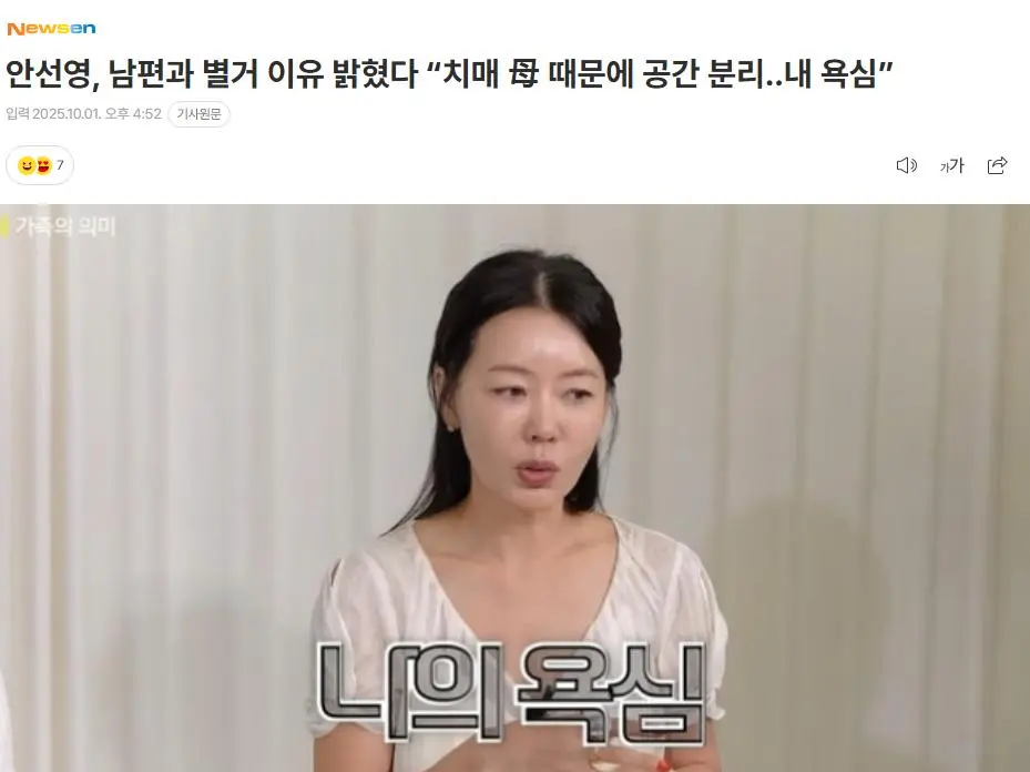 남편과 이혼설이 불거진 데 대해선 "'이대로 살다가는 모두가 불행해' 그래서 내린 결론이 분리를 좀 하자는 것"이라며 남편과 별거 중인 게 맞다고 밝혔다.