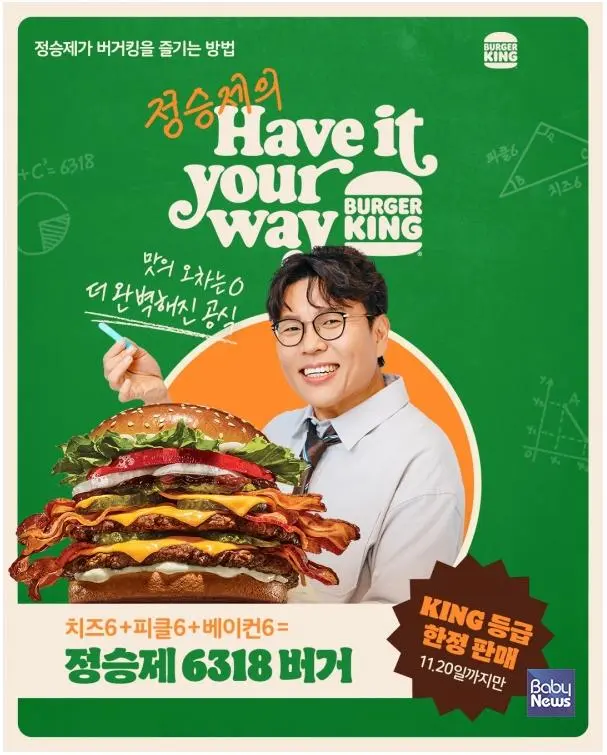 버거킹이 특정 인물이 직접 추천하는 메뉴 큐레이션을 통해 고객 경험을 확대하는 브랜드 캠페인 'Have it your way'의 두 번째 주인공을 국민 수학 강사 정승제 선정했다고 10일 밝혔다.
