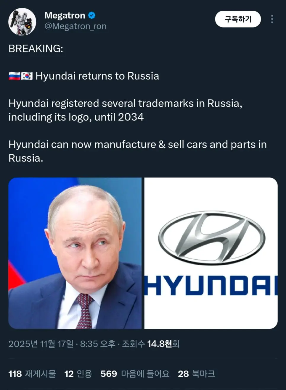 현대는 2034년까지 러시아에서 로고를 포함한 여러 상표를 등록했습니다.