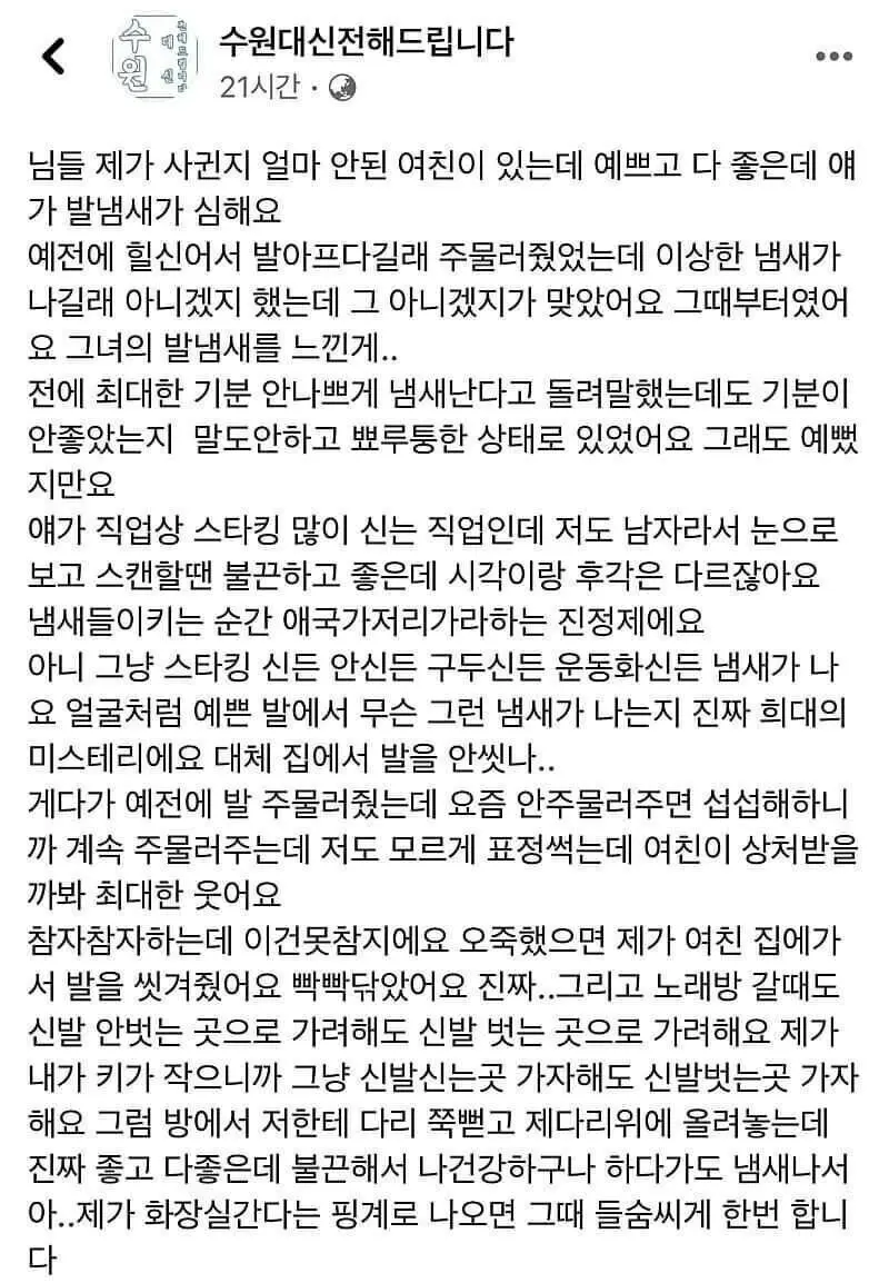 사귄지 얼마 안된 여친이 발냄새가 너무 심해요