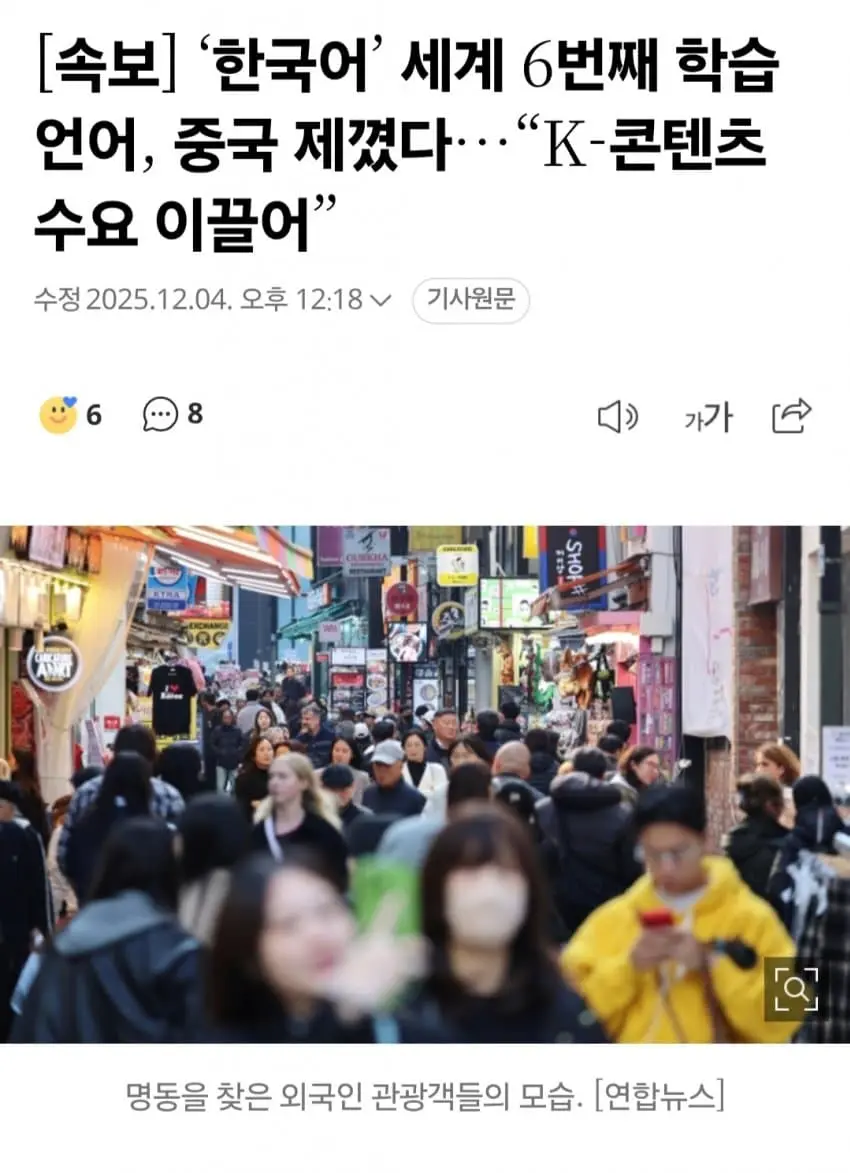 보고서에 따르면 한국어는 올해 영어, 스페인어, 프랑스어, 일본어, 독일어에 이어 6번째로 많이 학습된 언어로 나타났다. 지난해 6위였던 이탈리아어는 올해 7위로 내려갔다. 그 뒤를 이어 중국어·포르투갈어·힌디어 등의 순이었다. 세종대왕님, 김구 선생님 보고 계십니까?