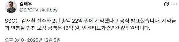 김재환 SSG행 2년 총액 22억