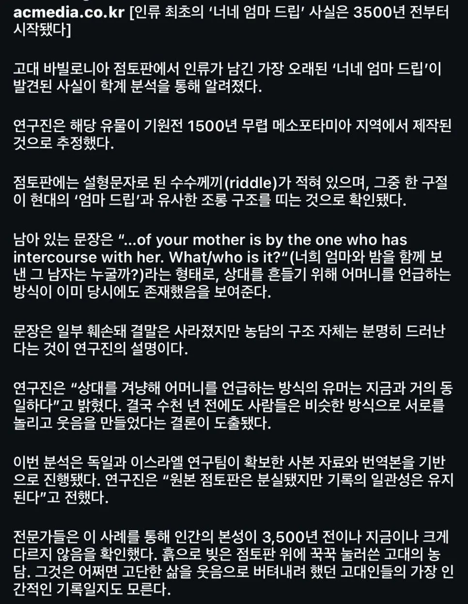 인류 최초의 '느금마' 드립 사실은 3500년 전부터 시작됐다.