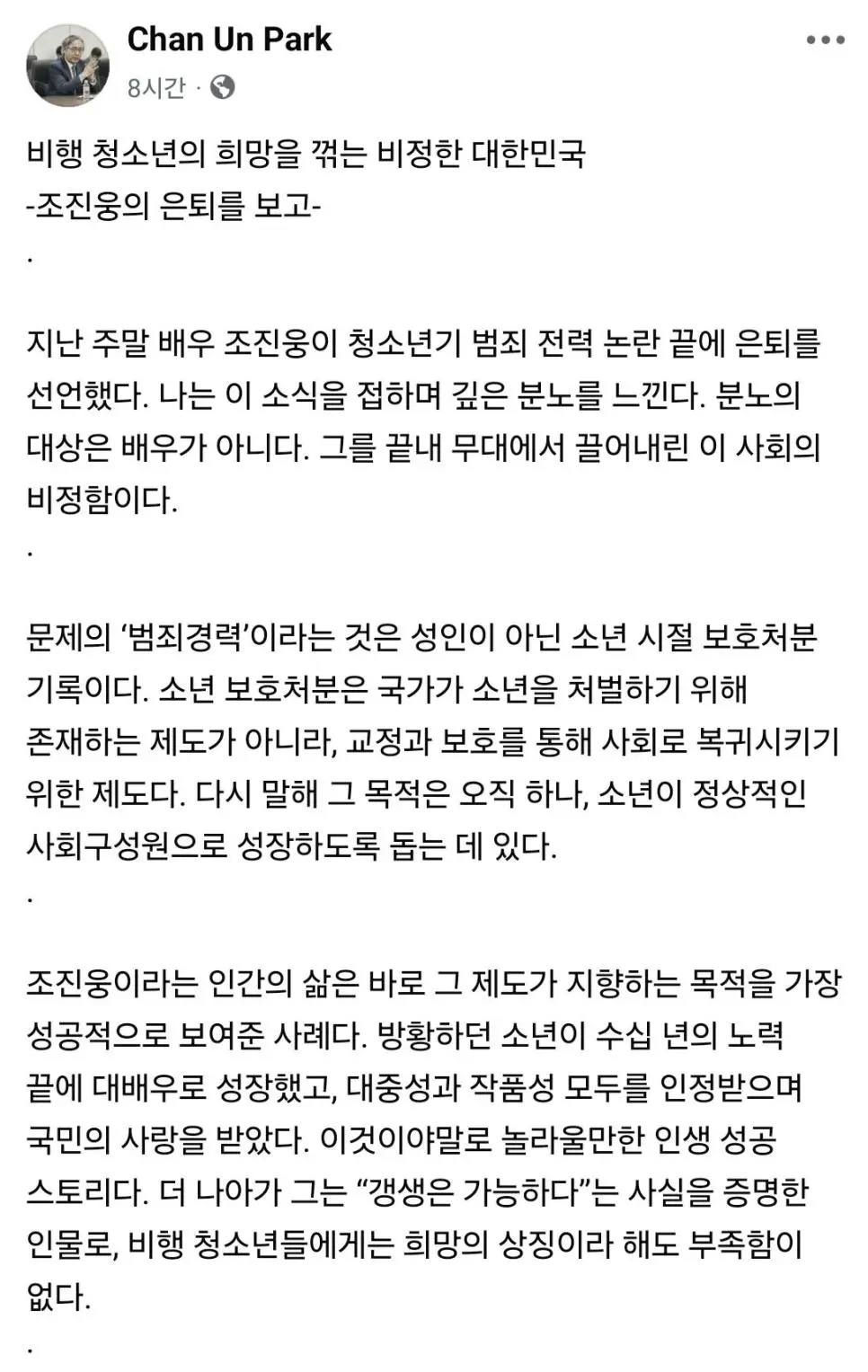 박찬운 한양대 교수, "조진웅 은퇴는 집단린치"