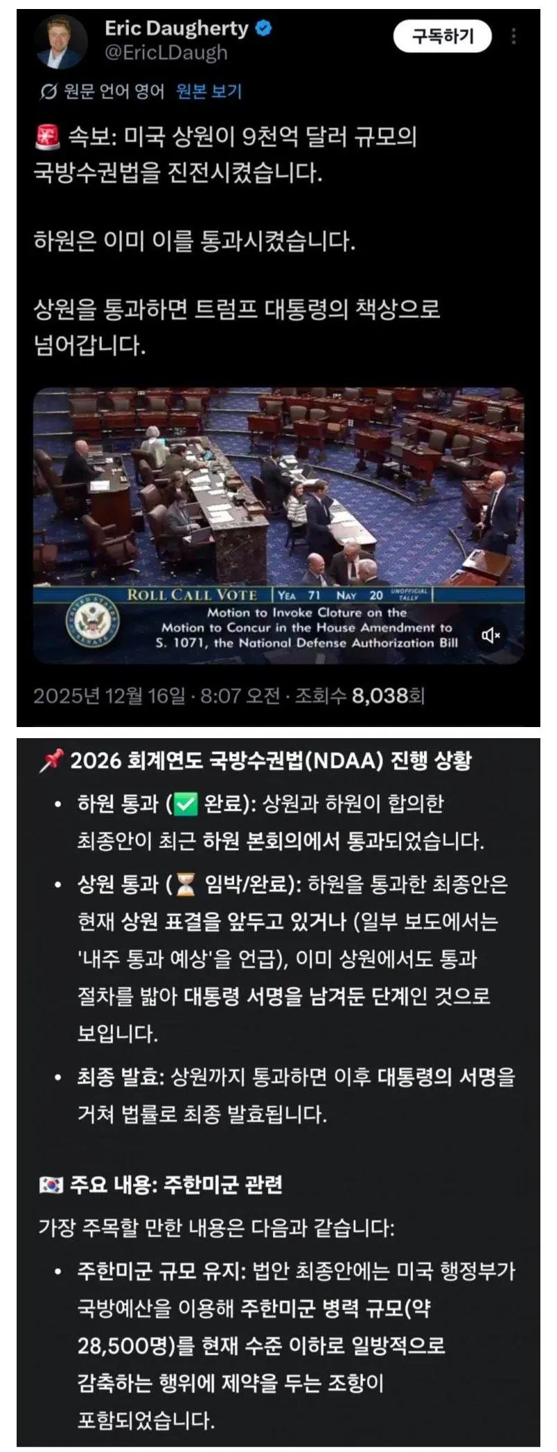 주한미군 규모 유지 국방수권법, "상원 통과"