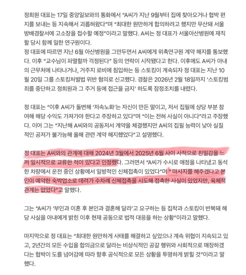 A씨와 24.3~25.6까지 “친밀한 교류”를 했었고