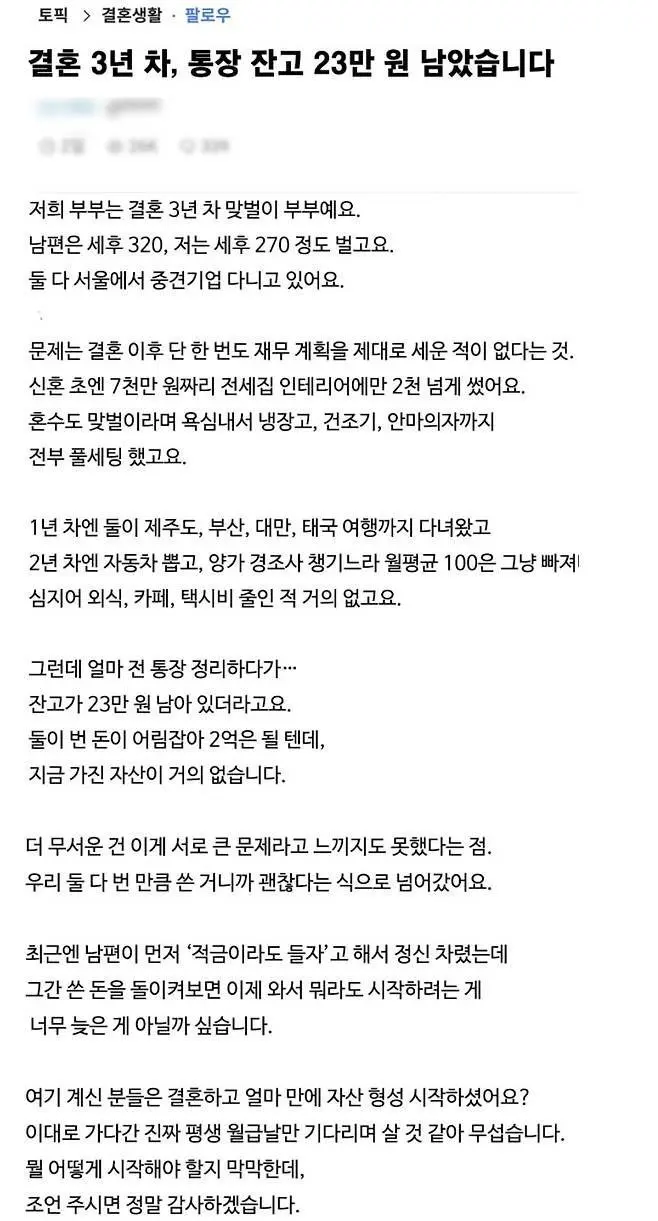 통장 잔고가 23만 원 남았다는 결혼 3년 차 신혼부부