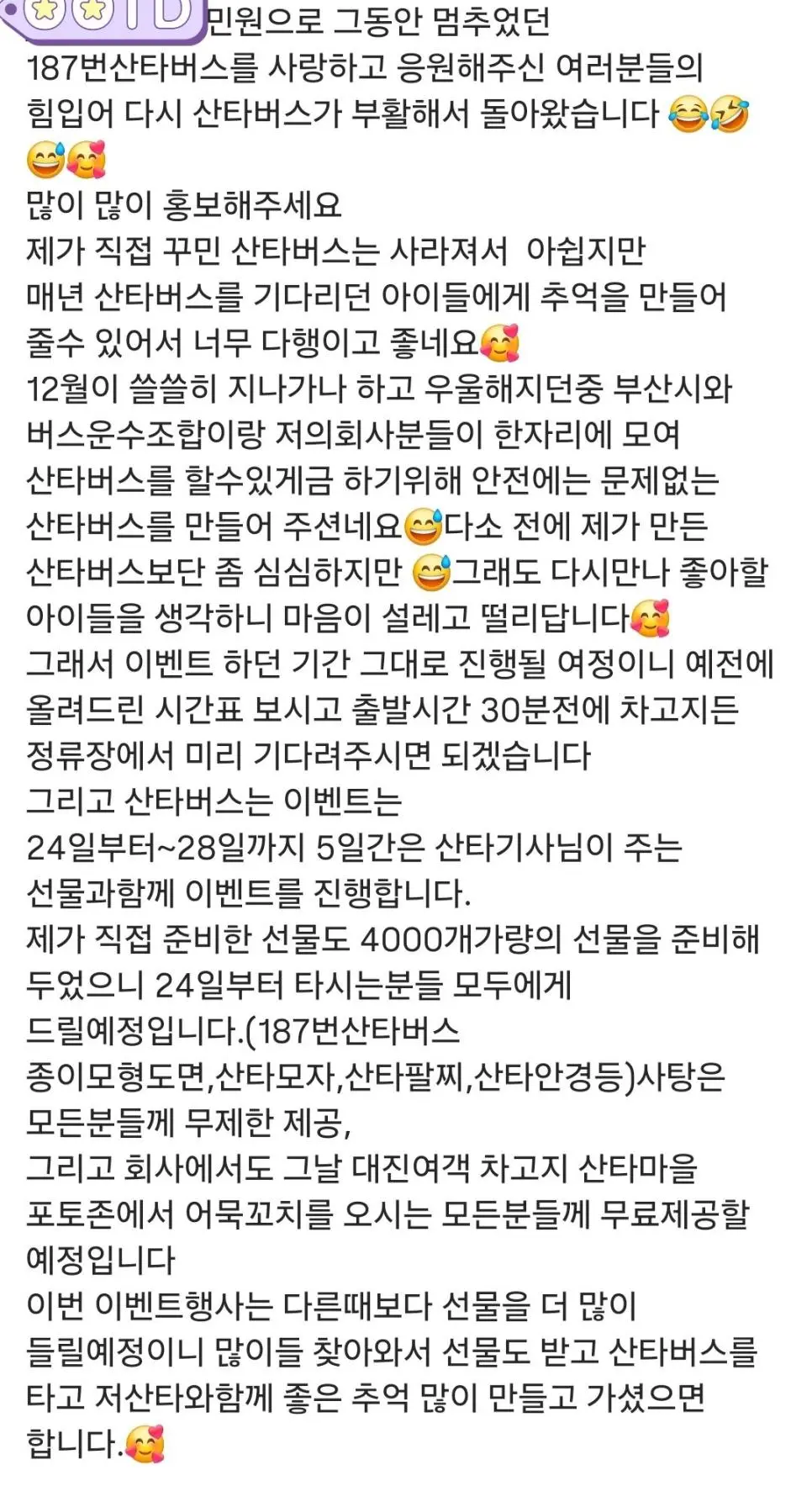 최근 악성 민원으로 사라졌던 부산 산타버스 근황