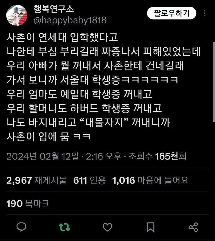 연세대 입학했다고 부심 부리는거 입 다물게함 ㅋㅋㅋㅋ