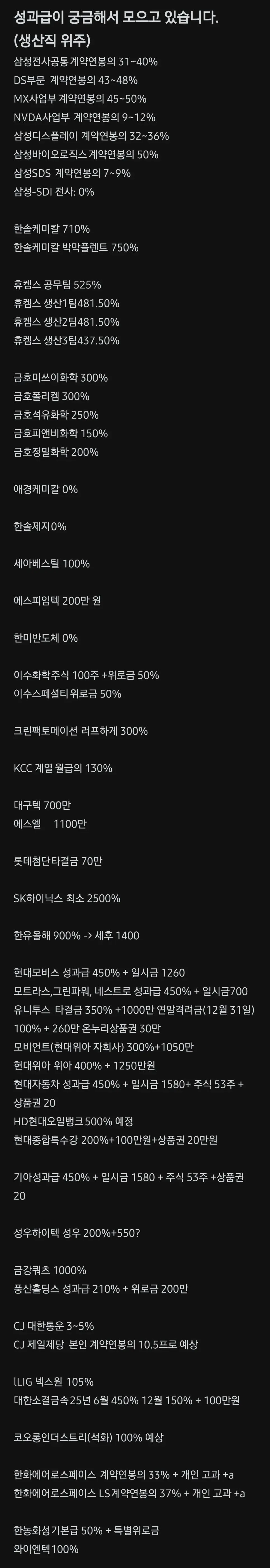 2025년 기업별 생산직 성과급