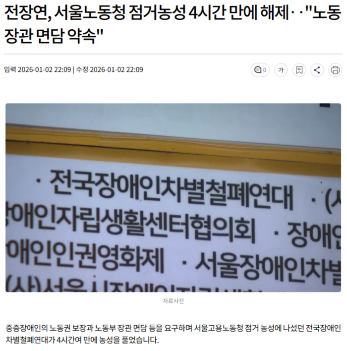 고용노동부는 전장연의 요구안을 검토한 뒤 이달 중으로 김 장관과 전장연의 면담을 추진하겠다고 답했으며, 전장연은 오후 4시쯤 점거 농성을 해제했습니다.