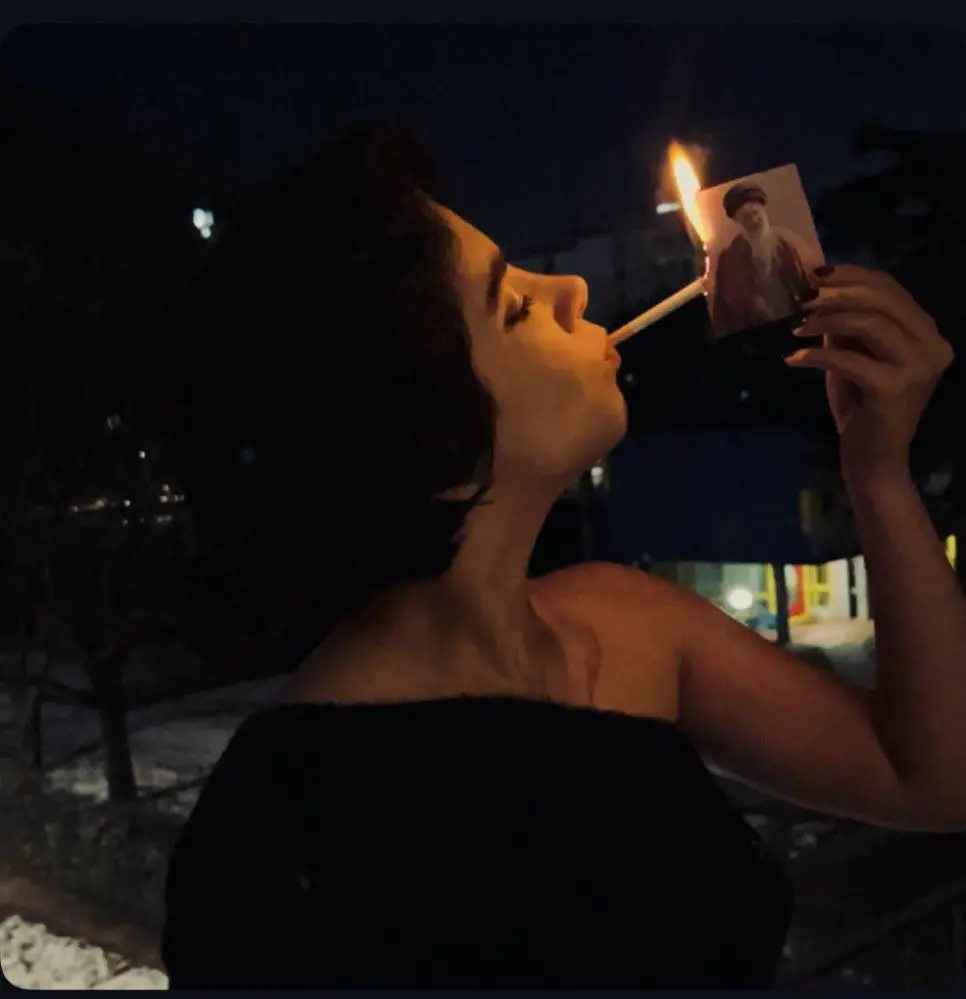 히잡 집어던지고 하메이니 사진으로 담배 불 붙이는중