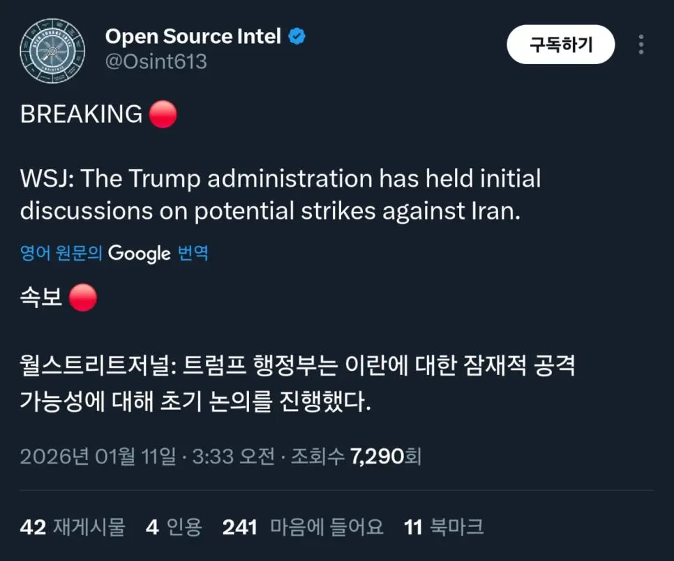 WSJ 트럼프, 이란 공습 공격 검토중...