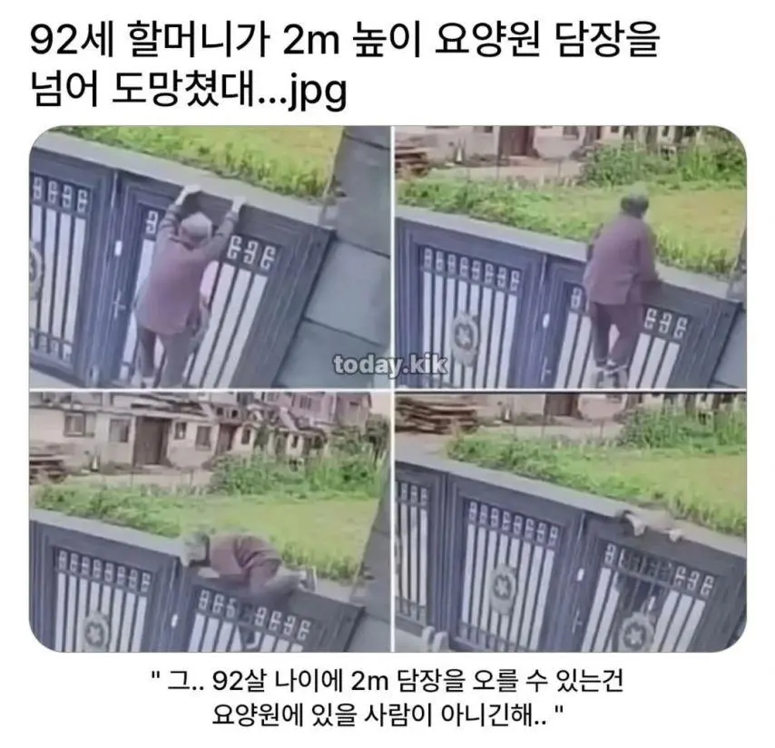 92세 할머니가 2m 높이 요양원 담장을 넘어 도망첬대