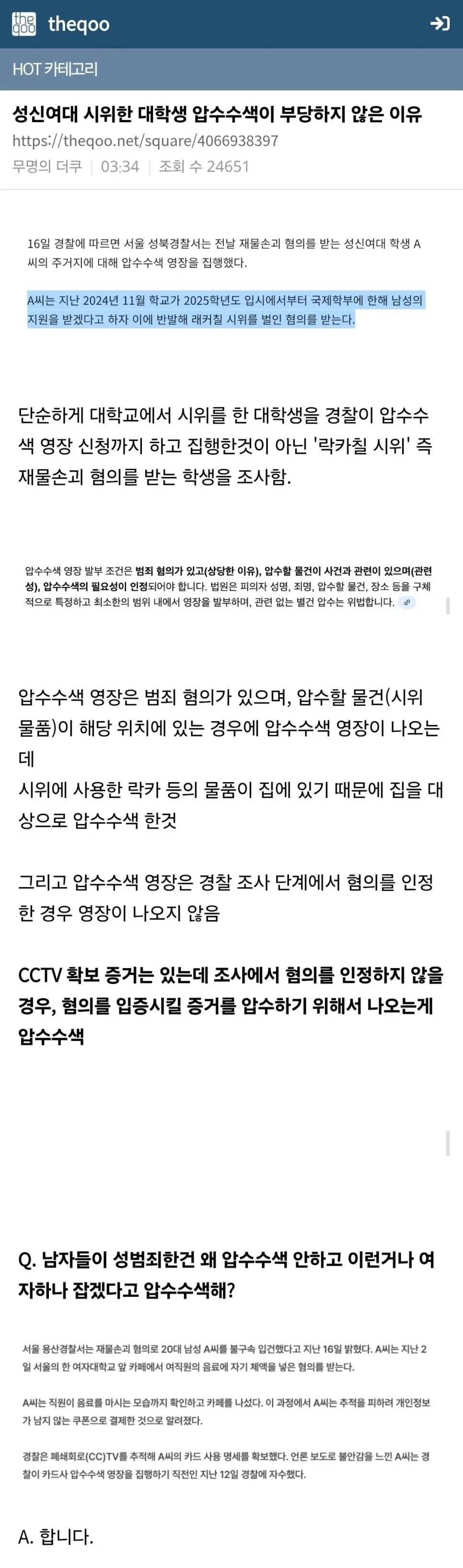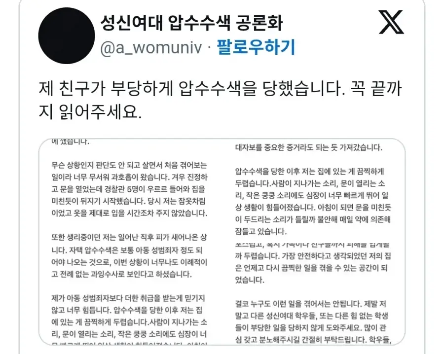부당하게 압수수색을 당했다는 성신여대생