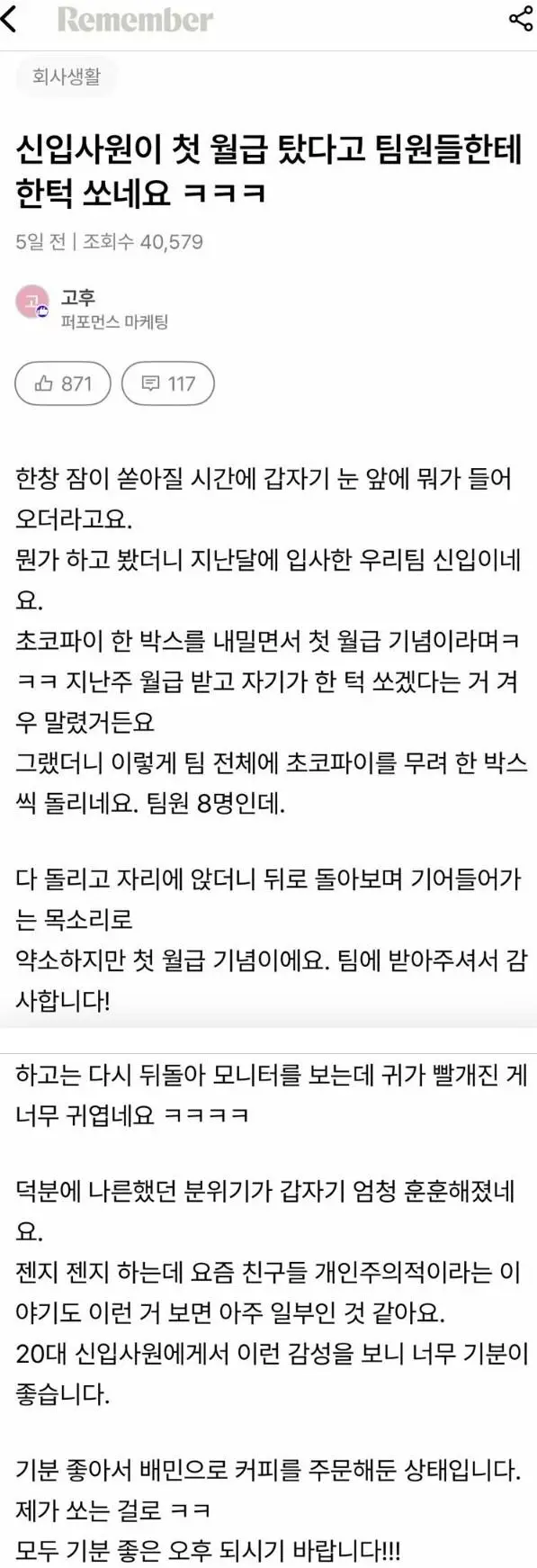 첫 월급 받고 한턱 쏜 신입사원