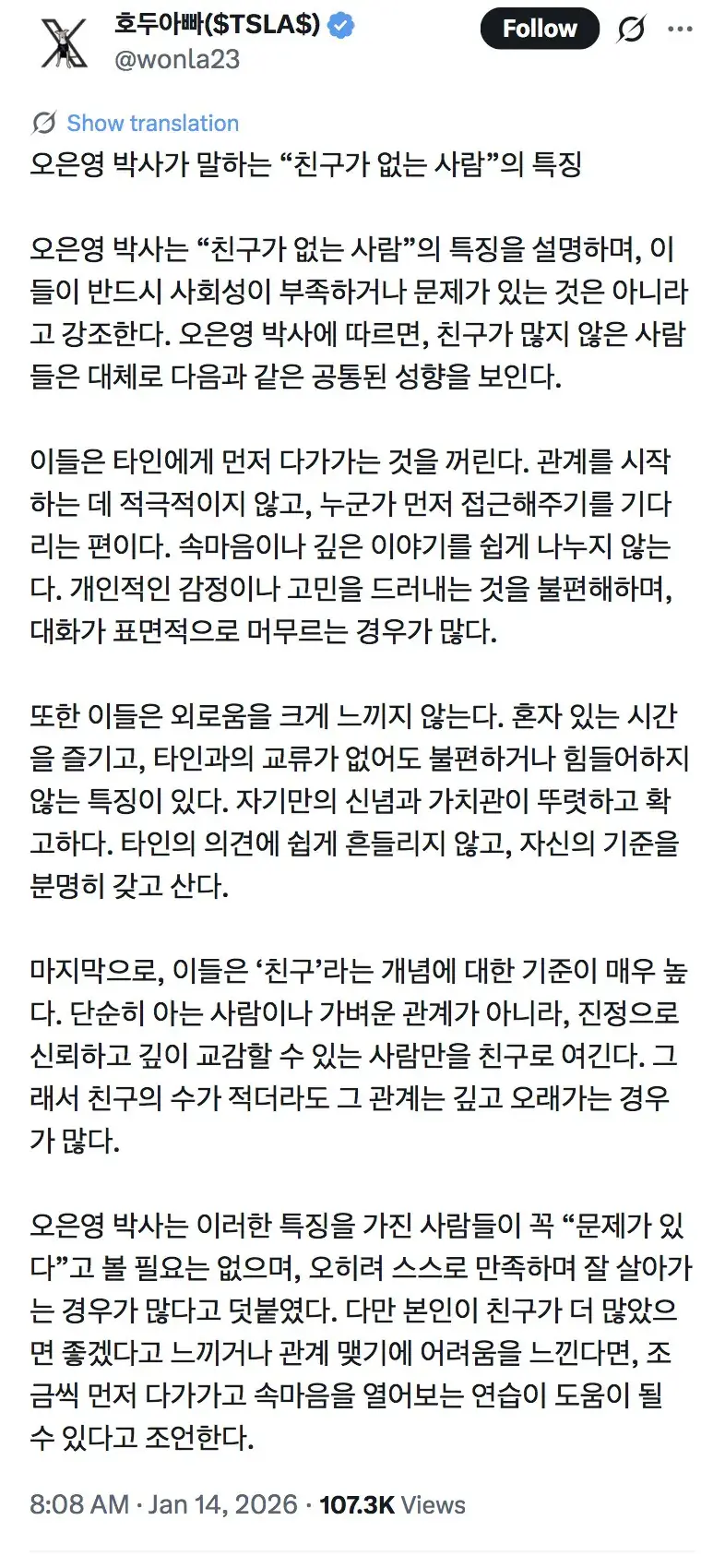 오은영 박사가 말 하는 ‘친구 없는사람의 특징‘