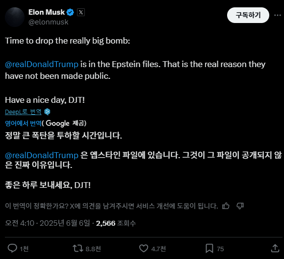 머스크가 트럼프 앱스타인에 연루되있다 폭로 웃긴 점..
