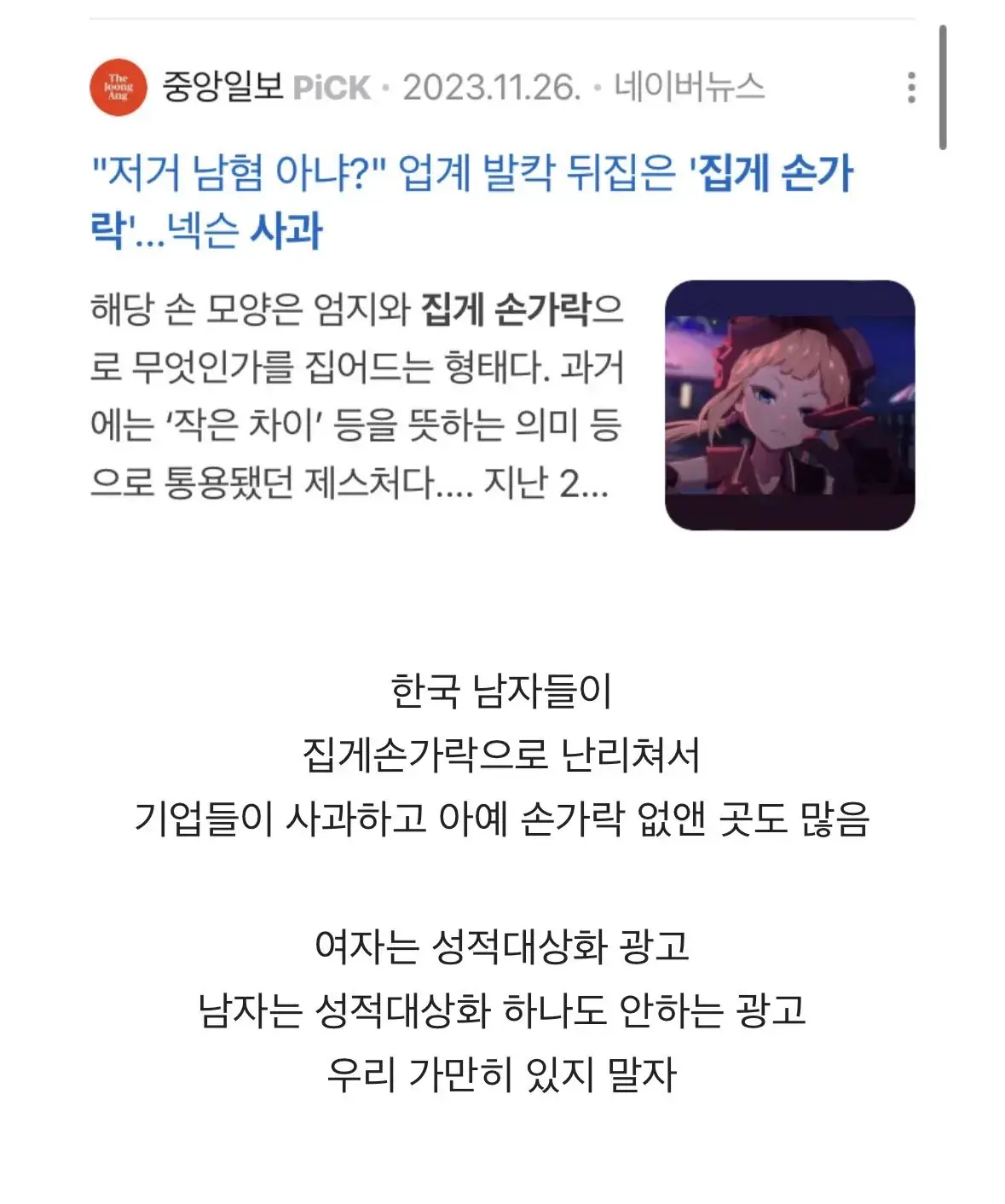 남자 집게 손가락 사건 언급하면서 화력 지원 해야한다고 하는 중 현재 유튜브 댓글 1200개 돌파 https://m.cafe.daum.net/subdued20club/ReHf/5564285?listURI=/subdued20club/ReHf 글 링크