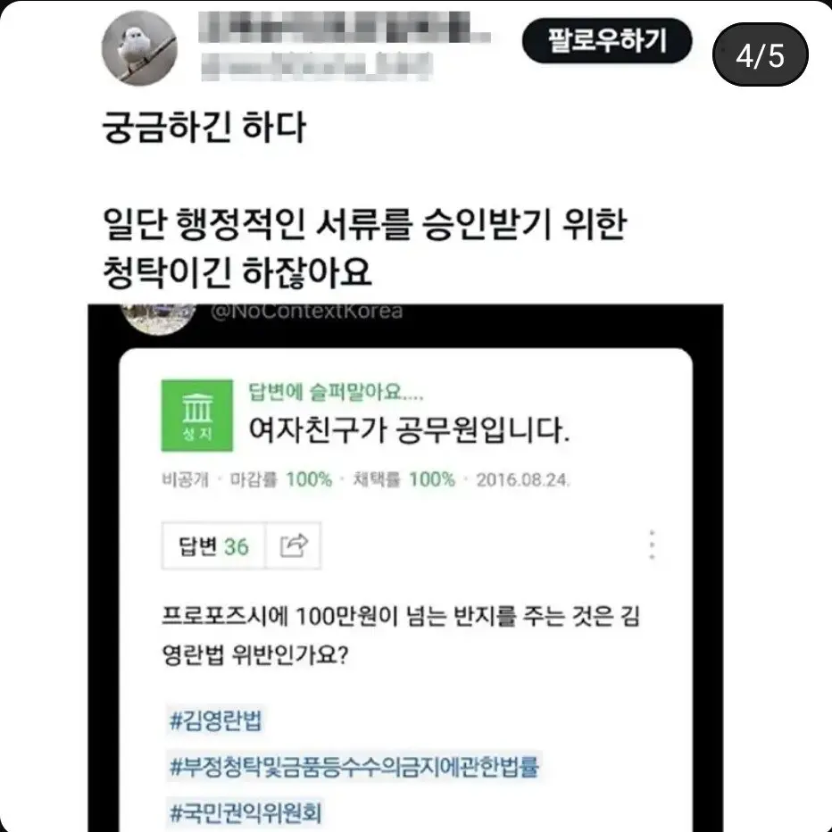공무원 여친한테 100만원 반지 주는건 불법인가요?