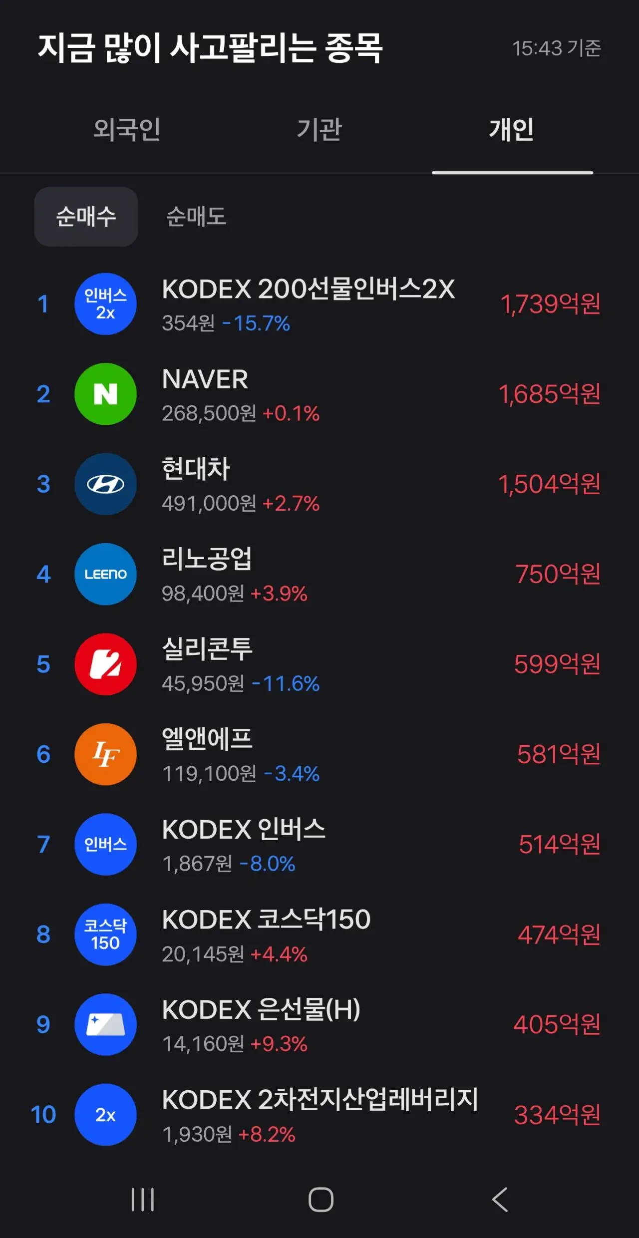 오늘 개인이 가장 많이 산 주식