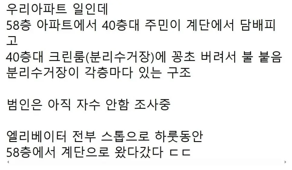 아파트 40층대에서 꽁초던져서 분리수거장 불낸 흡연자