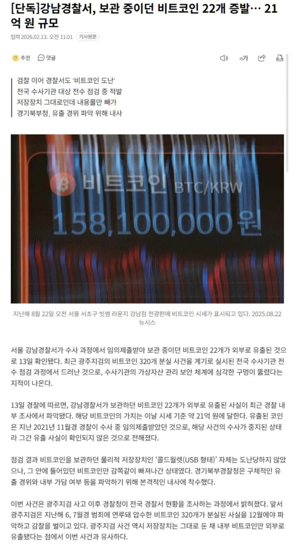 강남경찰서, 보관 중이던 비트코인 22개 증발… 21억 원 규모 ㄷㄷㄷ