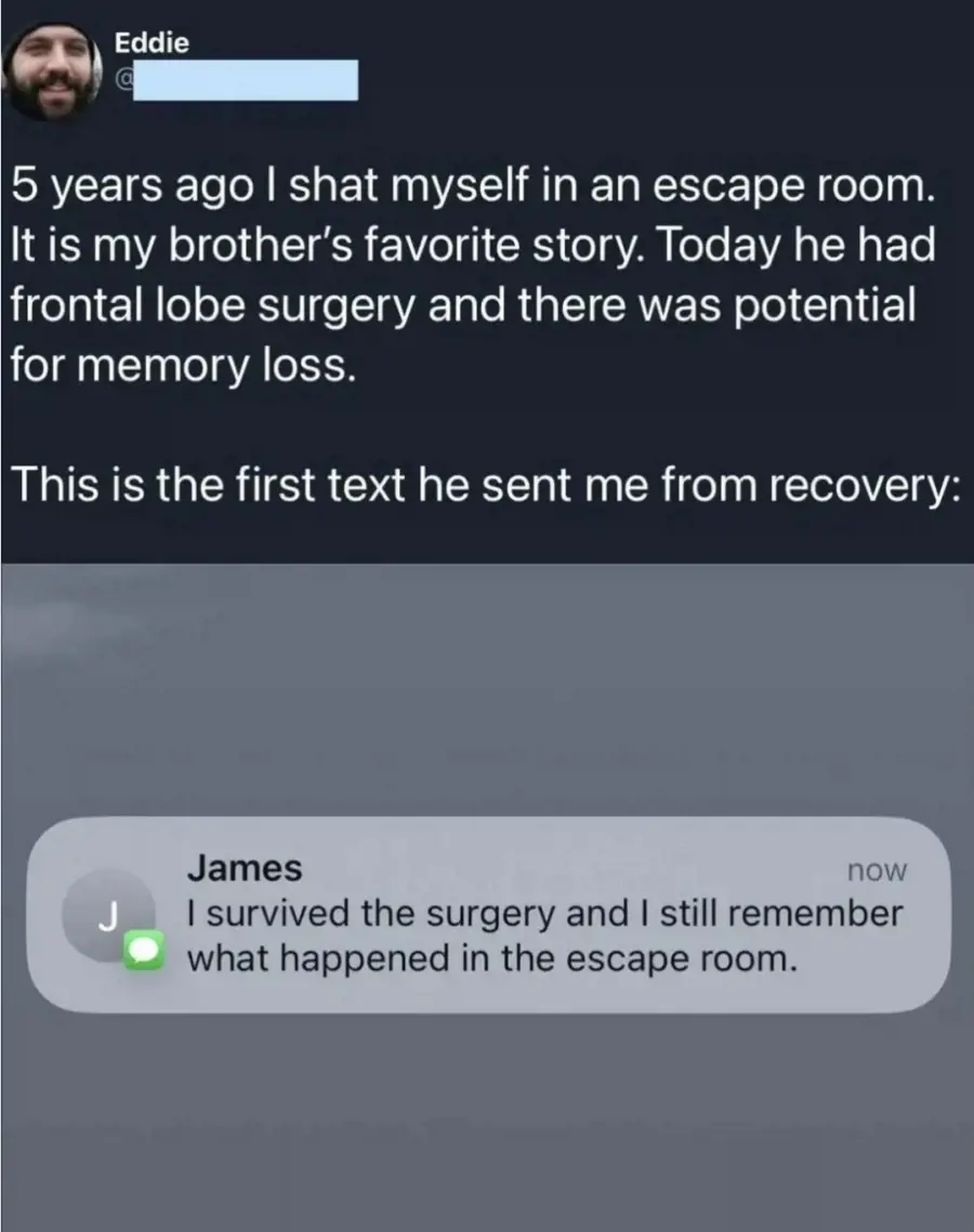 난 5년전에 방탈출 카페에서 똥을 지렸던 적이 있어. 내 동생이 제일 좋아하는 이야기지. 오늘 동생이 기억 상실이 생길 수 있는 전두엽 쪽 수술을 받았는데. 수술에서 회복하고 보낸 첫 문자가 이거야 제임스: 나 수술 겪고도 살아남았고 아직도 방탈출 카페에서 뭔일이 있었는지 기억함