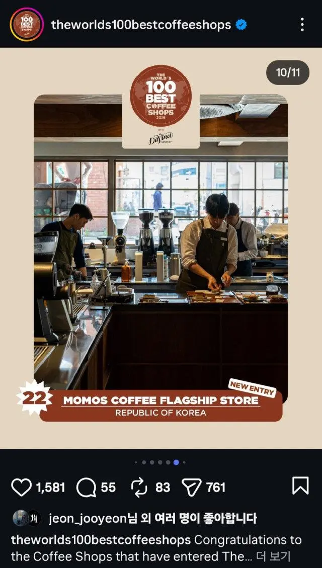 한국에서는 부산의 ‘모모스커피’와 서울의 ‘루리커피’가 각각 22위와 51위로 선정됐다.