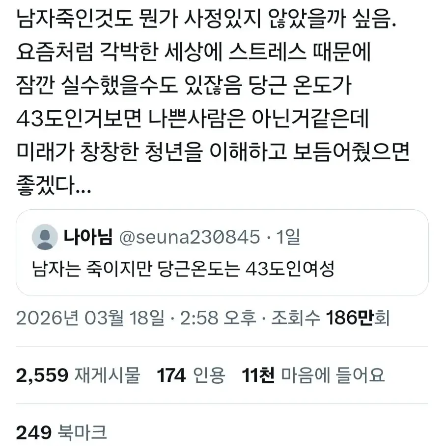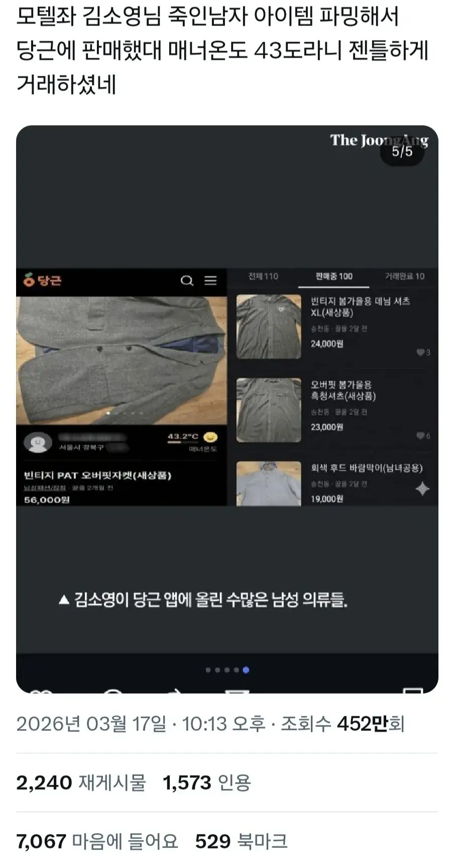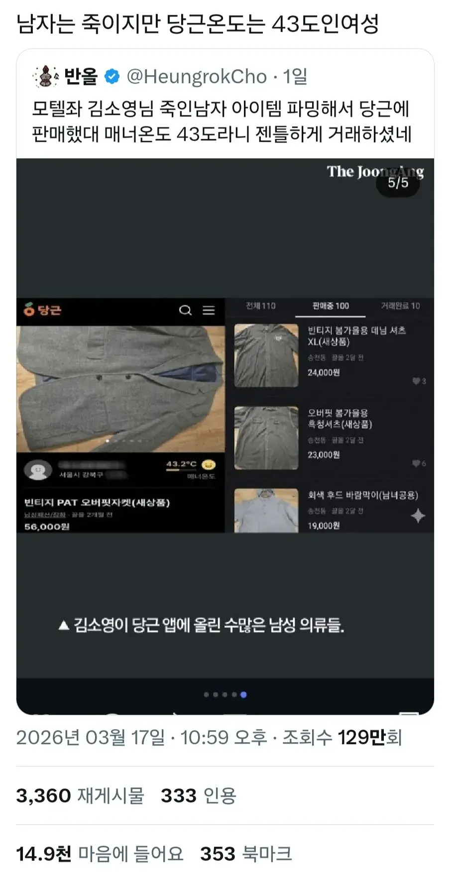 당근온도 43인 사람이 죽인 이유가 있을꺼라며 연대하는중 더 기괴한것은 450만 조회수와 14000개의 좋아요가 주작이 아니라는 사실이다 요약 여자폰에 X가 깔려있거나 X밈을 쓰면 반드시 도망쳐라