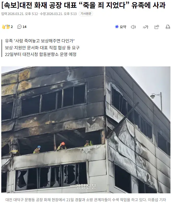 [속보]대전 화재 공장 대표 “죽을 죄 지었다” 유족에 사과