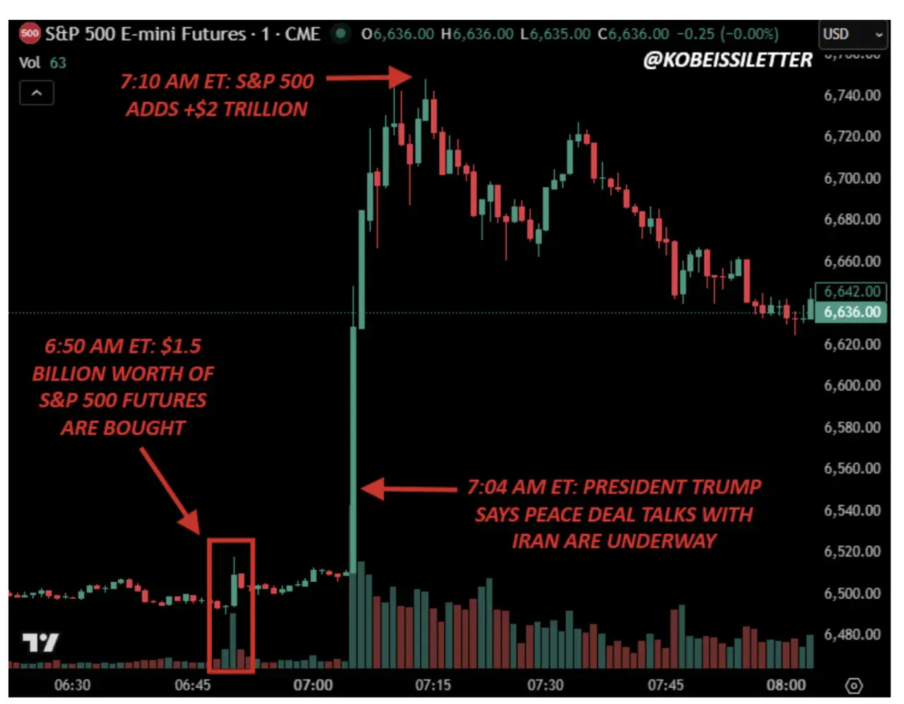 거대한 선물 매수와 지정학적 완화 발표 사이의 14분. 이건 명백한 내부자 거래(front running)입니다.