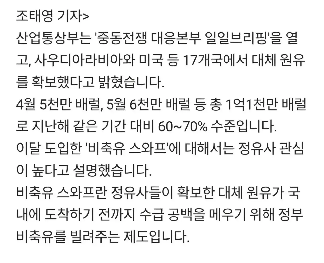 한국 원유 4.5월 도합 1억1천만 배럴 확보