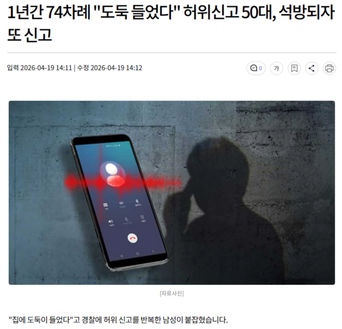 출동한 경찰은 남성에게 외부 침입 흔적이 없다는 점을 설명했으나 허위 신고가 반복되자 남성을 현행범으로 체포해 조사한 뒤 석방했습니다.