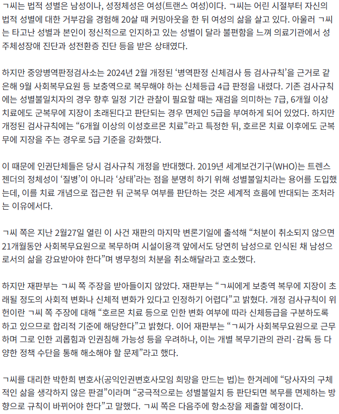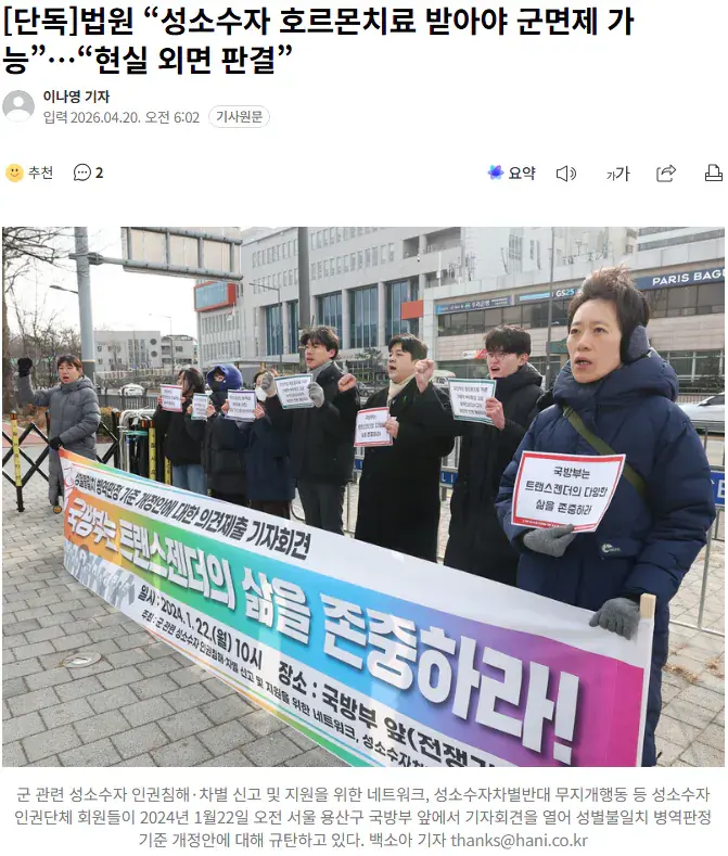 [단독]법원 “성소수자 호르몬치료 받아야 군면제 가능”…“현실 외면 판결…