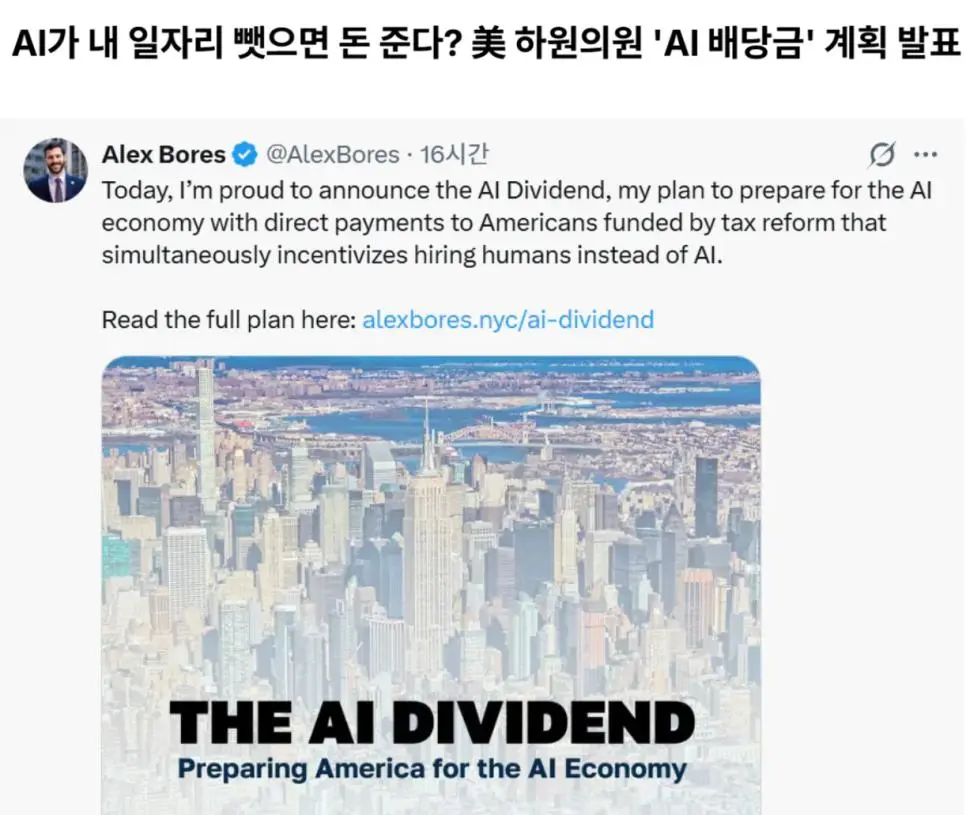 https://www.leadeconomy.co.kr/news/articleView.html?idxno=7184 AI가 인간 노동자를 대체할 경우 시민에게 직접 현금 지급 재원마련방안> 1. AI 사용에 세금 2. 주요 AI 기업 지분 확보 3. 노동·자본 과세 방식 개편