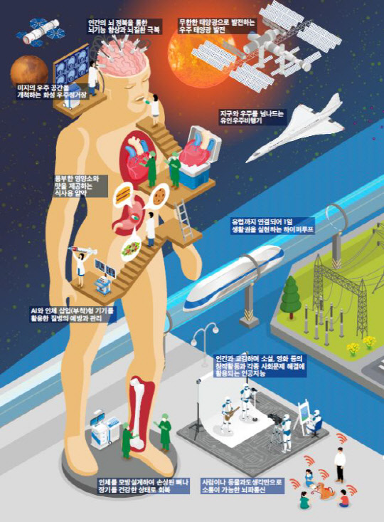 이밖에 미세플라스틱 친환경 처리, 플라스틱 대체신소재 개발을 통해 ‘제로 플라스틱 사회’를 구현하고, 원하는 대로 유전자(DNA)를 고쳐 쓰거나 줄기세포 치료 등을 통해 암, 유전질환 등 난치병을 극복하고, 초소형 로봇으로 몸 속의 생체변화를 감지해 질병을 예방하는 등 예방의료를 강화한다.