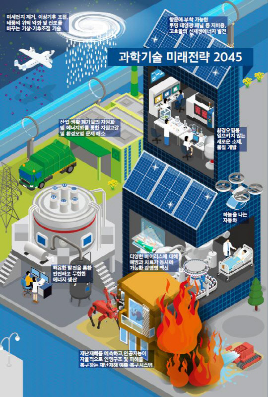 미래전략 2045는 지난해 정철희 삼성전자 고문을 위원장으로, 산·학·연 20인의 전문가로 구성·출범한 ‘2045 미래전략위원회’를 중심으로 대국민 설문조사, 대전·광주·부산 지역토론회, 스타트업(신생벤처기업) 대표 간담회, 기술·정책분야별 전문가 자문 등 1년 이상 사회 각계각층의 광범위한 의견을 수렴해 마련됐다.