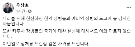 이어 “카투사에 복무하는 장병들 또한 대한민국의 국군 장병이자 누군가의 소중한 아들”이라면서 ”우 의원은 오늘 발언에 대해 공식 사과하라“고 촉구했다.