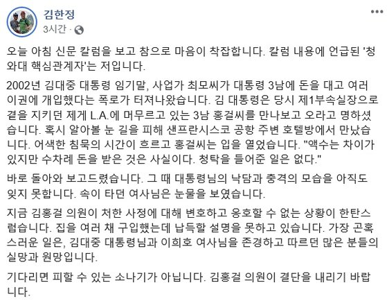 고(故) 김대중 전 대통령의 3남 김홍걸 더불어민주당 의원에 대해 같은 당 소속 김한정 의원이 18일 페이스북에서 한 말이다.