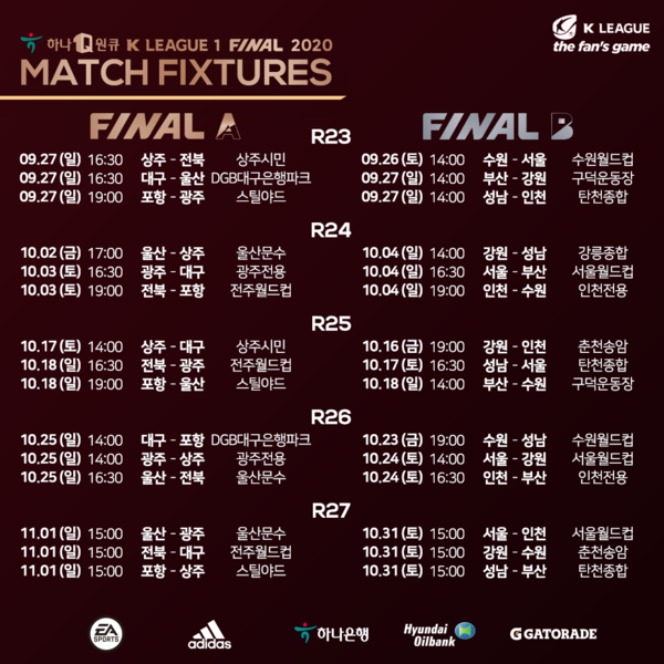 하나원큐 K리그1 2020의 파이널 라운드 일정과 대진이 확정됐다. 9월 26일, 27일 열리는 23라운드부터 10월 31일, 11월 1일 열리는 27라운드 최종전까지 각 팀별로 5경기씩을 치르게 된다. '파이널A'에 진출한 6개 팀은 우승과 AFC챔피언스리그 출전권 획득을 위한 경쟁을, '파이널B'에 속한 6개팀은 K리그1 잔류를 위한 경쟁을 벌이게 된다.