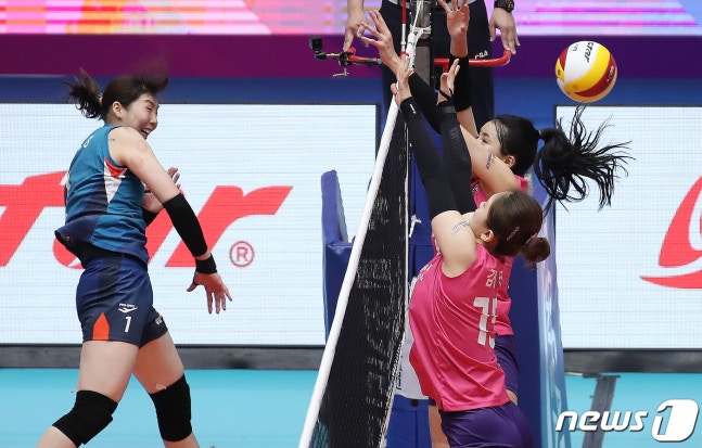 5일 오후 충북 제천실내체육관에서 열린 2020 제천·MG새마을금고컵 프로배구대회 여자부 결승전 GS칼텍스와 흥국생명의 경기에서 GS칼텍스 이소영이 흥국생명 블로커 앞에서 스파이크 공격을 하고 있다. 2020.9.5/뉴스1 © News1 김진환 기자