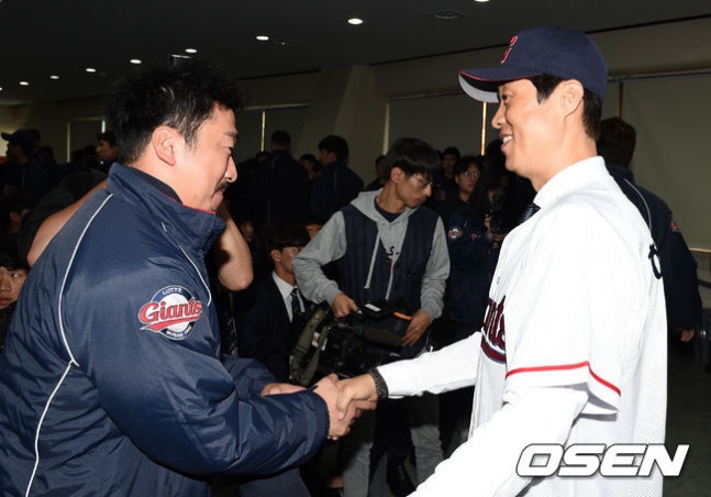 [OSEN=부산, 이대선 기자] 지난해 11월 취임식을 가진 롯데 허문회 감독이 이병규와 인사를 나누고 있다.