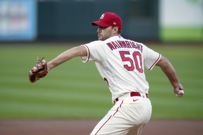 St. Louis Cardinals starting pitcher Adam Wainwright throws during the first inning of a baseball game against the Milwaukee Brewers Saturday, Sept. 26, 2020, in St. Louis. (AP Photo/Jeff Roberson)<저작권자(c) 연합뉴스, 무단 전재-재배포 금지>