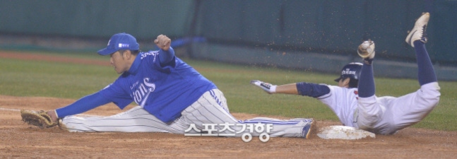 프로야구 두산 베어스 정수빈이 지난 2013년 서울 잠실야구장에서 열린 삼성 라이온즈와의 한국시리즈 5차전 경기에서 1회말 1사 2루 땅볼을 치고 1루에서 세이프되고 있다. 이석우 기자