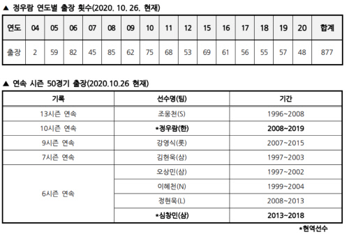 꾸준함의 대명사로 불리는 정우람은 2006년과 2008년에는 각각 82경기, 85경기에 출장해 당해 최다 경기 출장 투수에 오르기도 했다. 특히 2008년에 기록한 85경기는 KBO리그 한 시즌 투수 최다 출장 기록으로 2004년 류택현(LG)과 타이다.