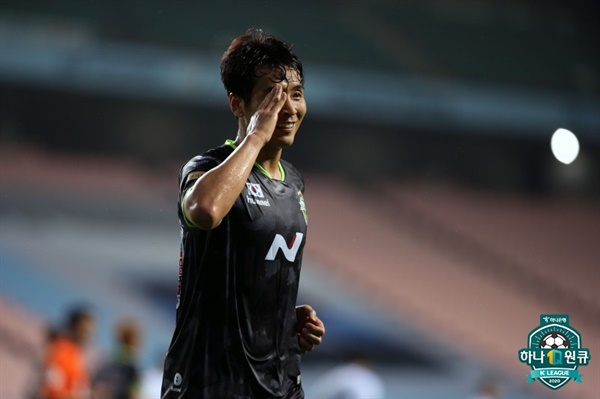 | ▲ 지난 18일 전주월드컵경기장에서 열린 전북현대모터스와 광주FC의 경기. 손준호 선수가 골 세레머니를 하고 있다. |